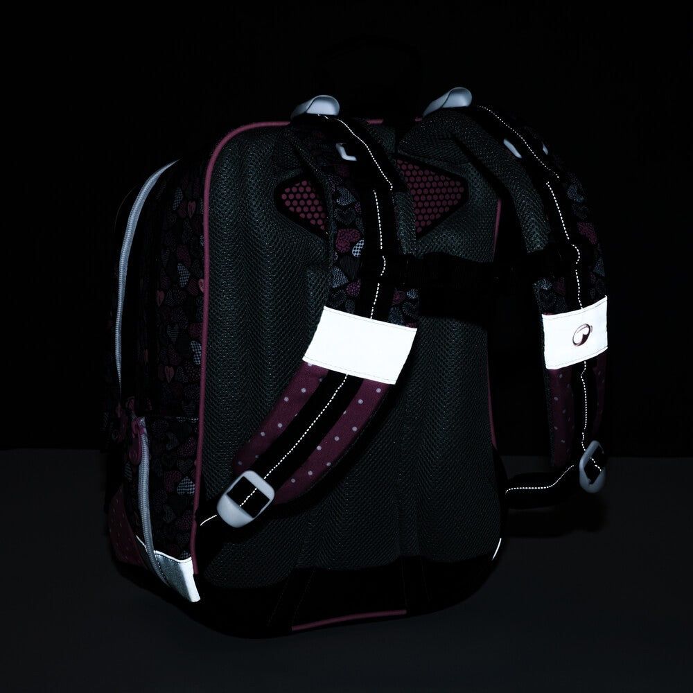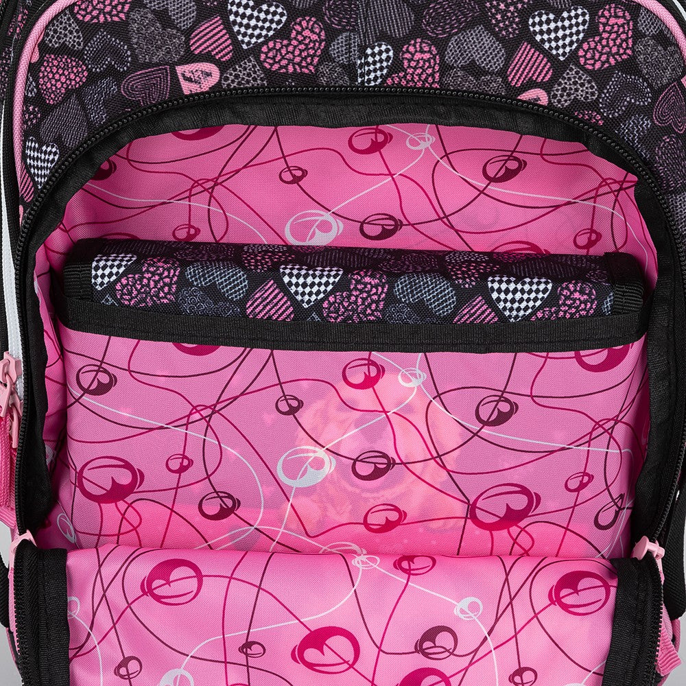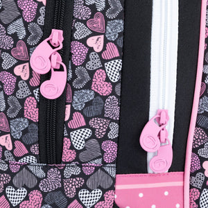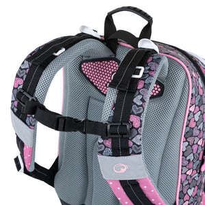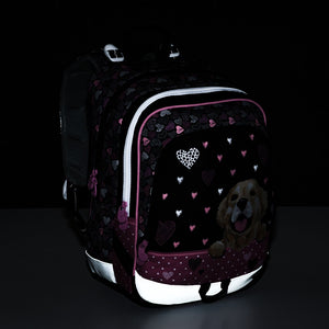 Scuola elementare dalla prima alla terza elementare. Zaino scolastico a tre scomparti per bambine, con motivo a cane. Schienale imbottito. Zaino capiente con organizer. Gancio per chiavi. Fondo imbottito. Piedini in plastica. Elementi riflettenti.