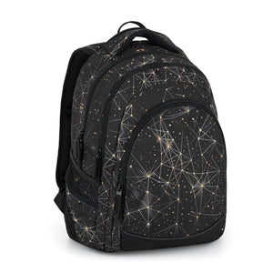 Uno zaino elegante per le ragazze che puntano alle stelle. Questo zaino nero con costellazione dorata non è solo bello, ma anche funzionale. Ha una tasca segreta sul retro, una cinghia pettorale regolabile e pesa solo 0,8 kg, il che lo rende comodo anche per un uso prolungato. Tre ampi scomparti offrono ampio spazio, tra cui una tasca per laptop e un organizer per telefono o piccoli oggetti. È inoltre dotato di elementi riflettenti per la sicurezza e di un'etichetta cucita per il nome in caso di smarrimento dello zaino.