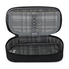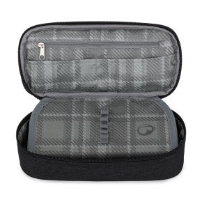 Ogni oggetto trova il suo posto: penne e matite si collocano in venti elastici interni, mentre compassi, gomme, righello e evidenziatori trovano spazio sotto la patta con gli elastici. Sotto il coperchio ci sono anche una piccola tasca e scomparti per documenti, varie tessere o chiavette USB.
