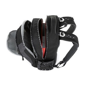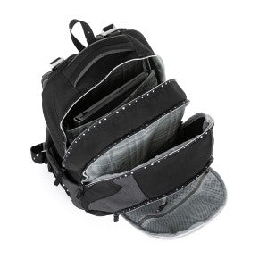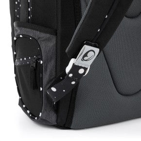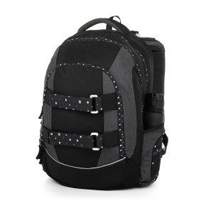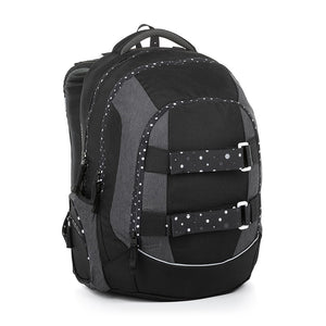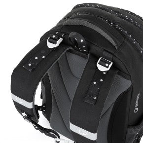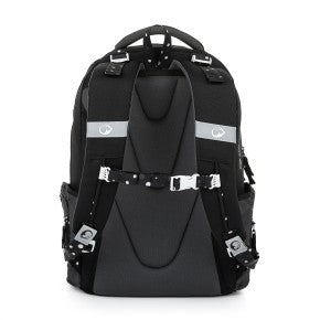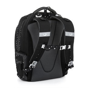 Zaino Bagmaster Flick, ideale dalle scuole medie in poi, leggero e capiente: pesa solo 1,1 kg e ha uno schienale anatomico con mesh 3D e spallacci sagomati che scaricano il carico sulla zona lombare. Offre tre scomparti (principale per cartelle XXL e fogli A4, centrale per quaderni e astuccio, frontale con organizer interno) più due tasche laterali (una per la borraccia, una con zip per piccoli oggetti). Il fondo rinforzato con piedini garantisce stabilità e pulizia. I cinturini camouflage servono anche come portaskate, mentre gli inserti rifrangenti, il manico superiore e il gancetto per badge o chiavi lo rendono pratico e sicuro. Capacità fino a 10 kg, garanzia 3 anni, materiali conformi alle normative UE.