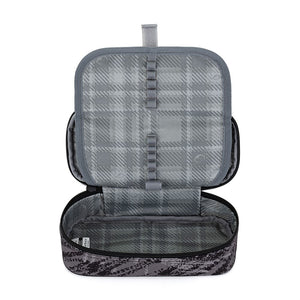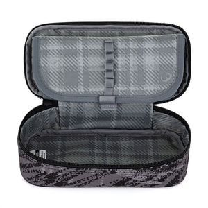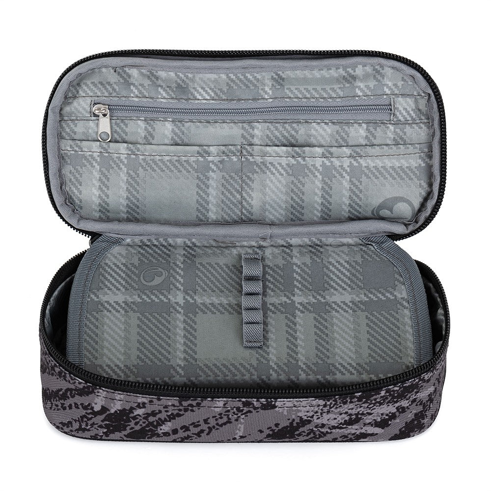 Astuccio grigio per bambini e bambine. Il doppio divisorio è dotato di passanti in gomma per penne e pennarelli, mentre altri accessori trovano posto nello spazio sottostante. Si chiude comodamente con una cerniera a un solo cursore.