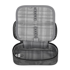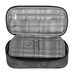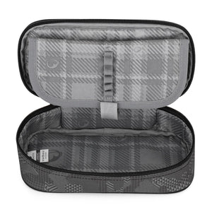 Astuccio grigio per bambini e bambine. Il doppio divisorio è dotato di passanti in gomma per penne e pennarelli, mentre altri accessori trovano posto nello spazio sottostante. Si chiude comodamente con una cerniera a un solo cursore.