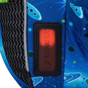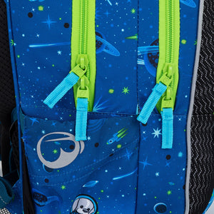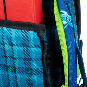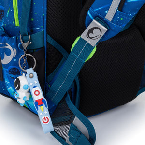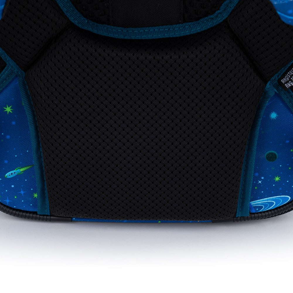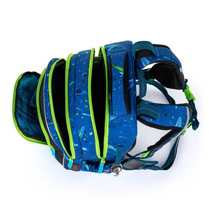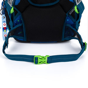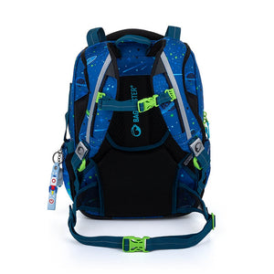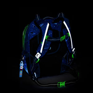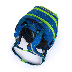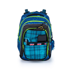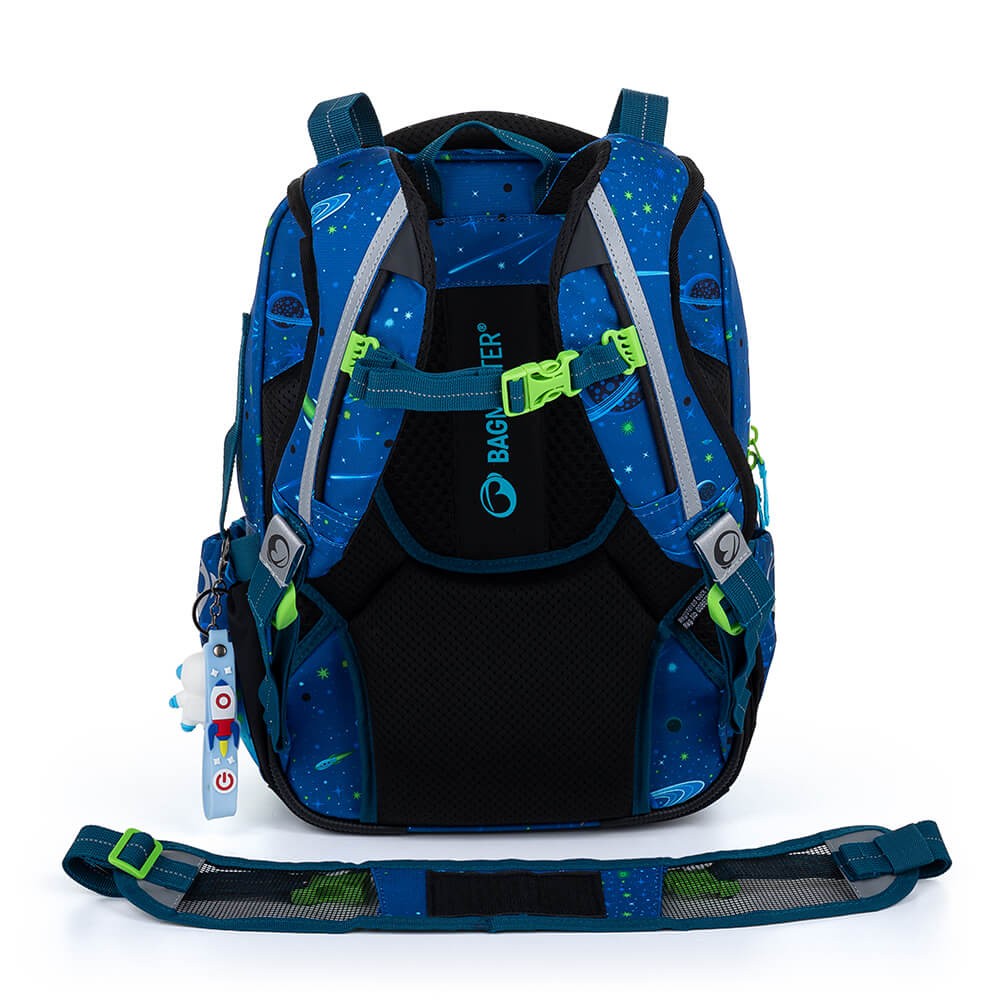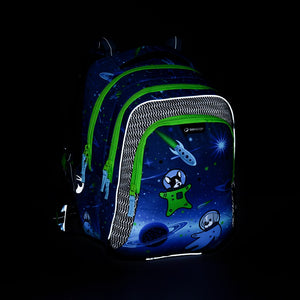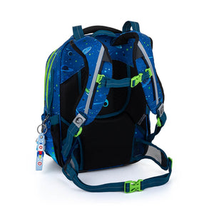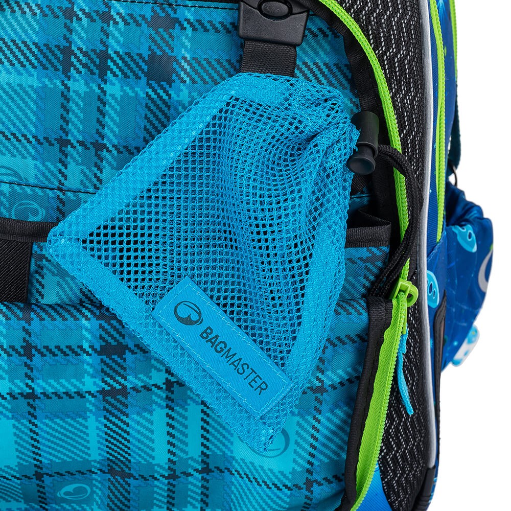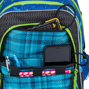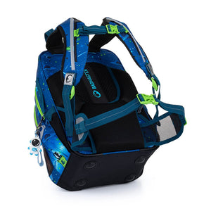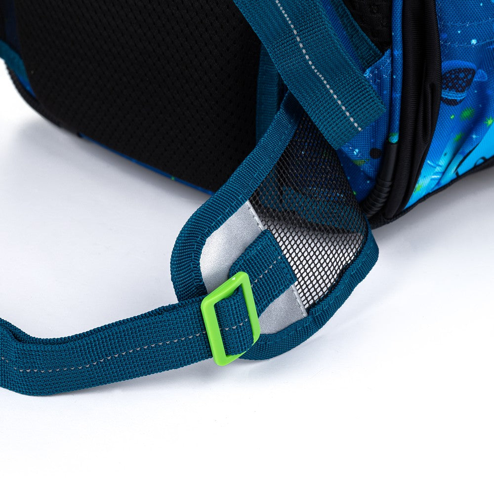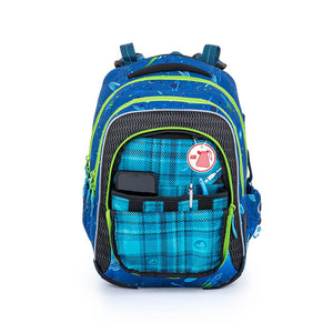 Uno zaino scolastico a tre scomparti per i bambini della prima elementare che amano la combinazione verde-blu e il mondo esterno. Pesa meno di un chilogrammo, ha un nuovo sistema di sicurezza per la schiena con cintura sui fianchi, elementi riflettenti, un pratico organizer e una tasca laterale per le bevande. La rete degli spallacci e dello schienale anatomici è morbida e non graffia.