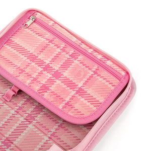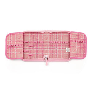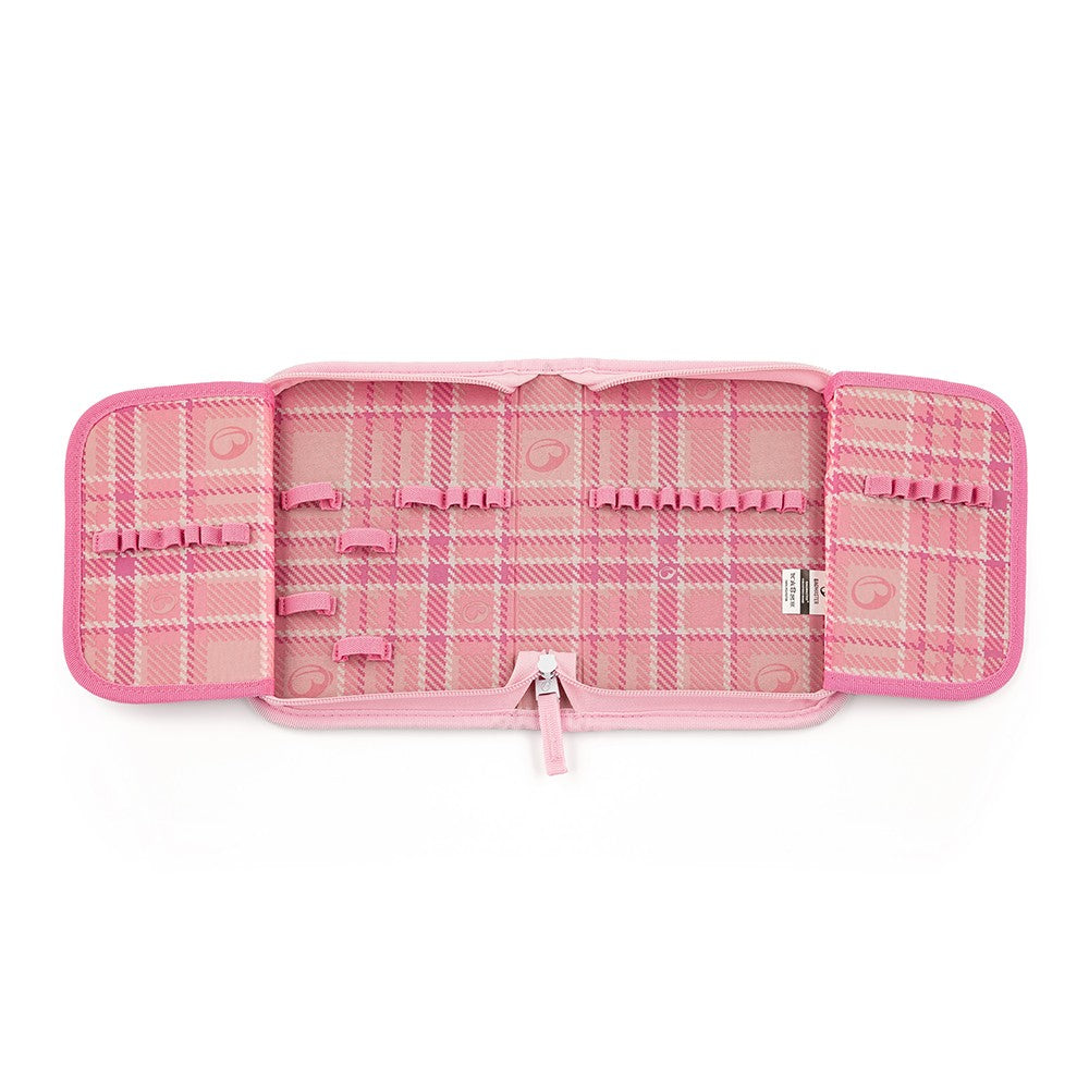 Astuccio rosa e azzurro per bambine. Due alette apribili con impugnatura in gomma per matite, penne e pastelli, e tasche per altri piccoli oggetti.