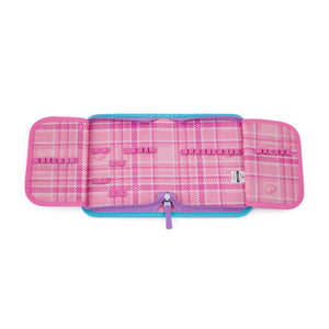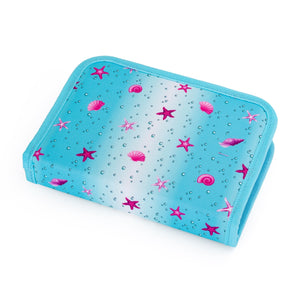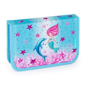 Astuccio rosa e blu con un mondo sottomarino per le piccole studentesse. Due alette apribili hanno impugnature in gomma per matite, penne e pastelli e una tasca per altri piccoli oggetti.