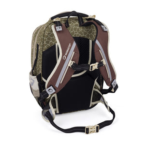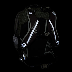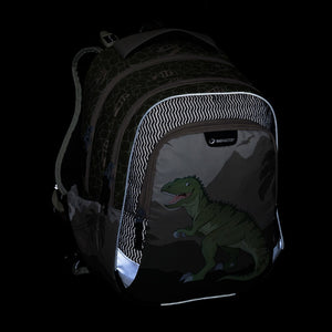 Il motivo con dinosauri porta un tocco di preistoria a scuola, mentre gli elementi riflettenti garantiscono sicurezza ad ogni passo.