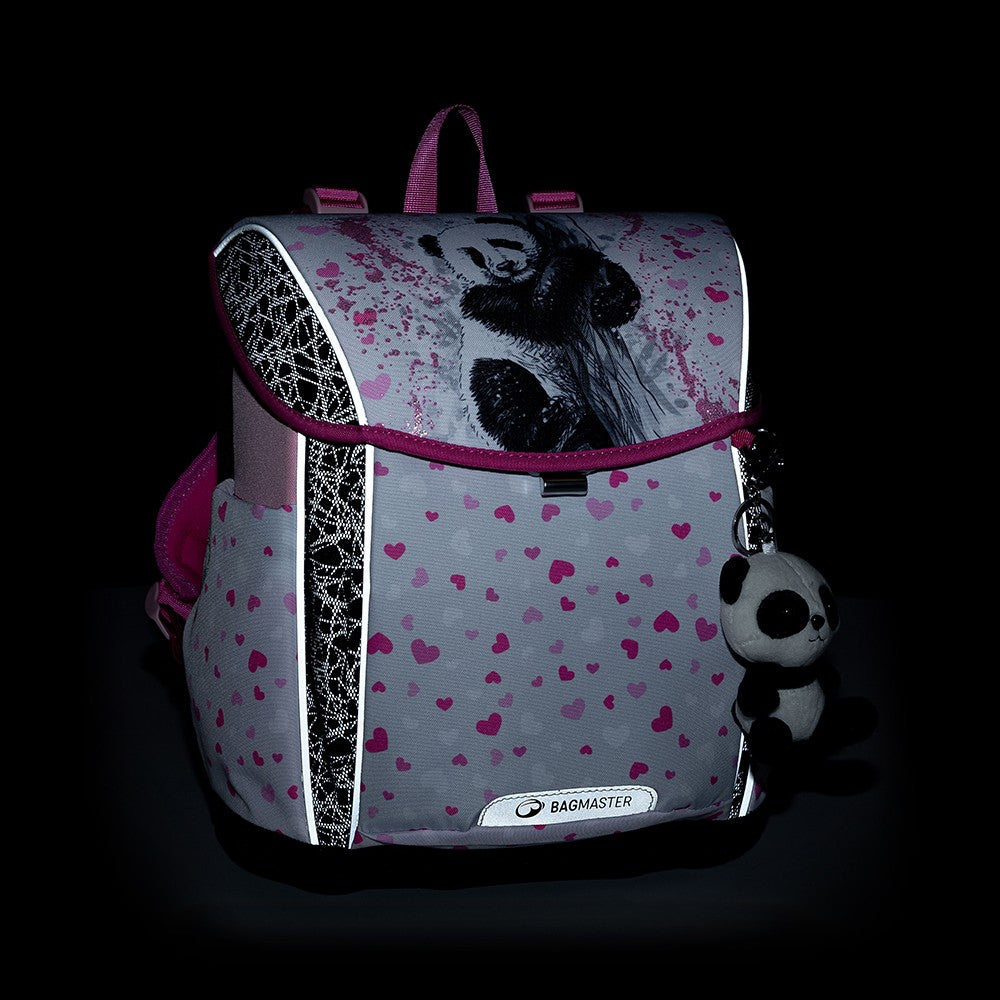 Una graziosa cartella Bagmaster rosa-grigia con un tenero panda per tutte le bambine di prima e seconda elementare. È leggerissima, ha uno schienale ergonomico e uno scomparto principale ampio e trasparente. Le tasche laterali possono contenere una borraccia e un ombrello. La cartella è decorata con un motivo femminile, un ciondolo di pelliccia ed elementi riflettenti.