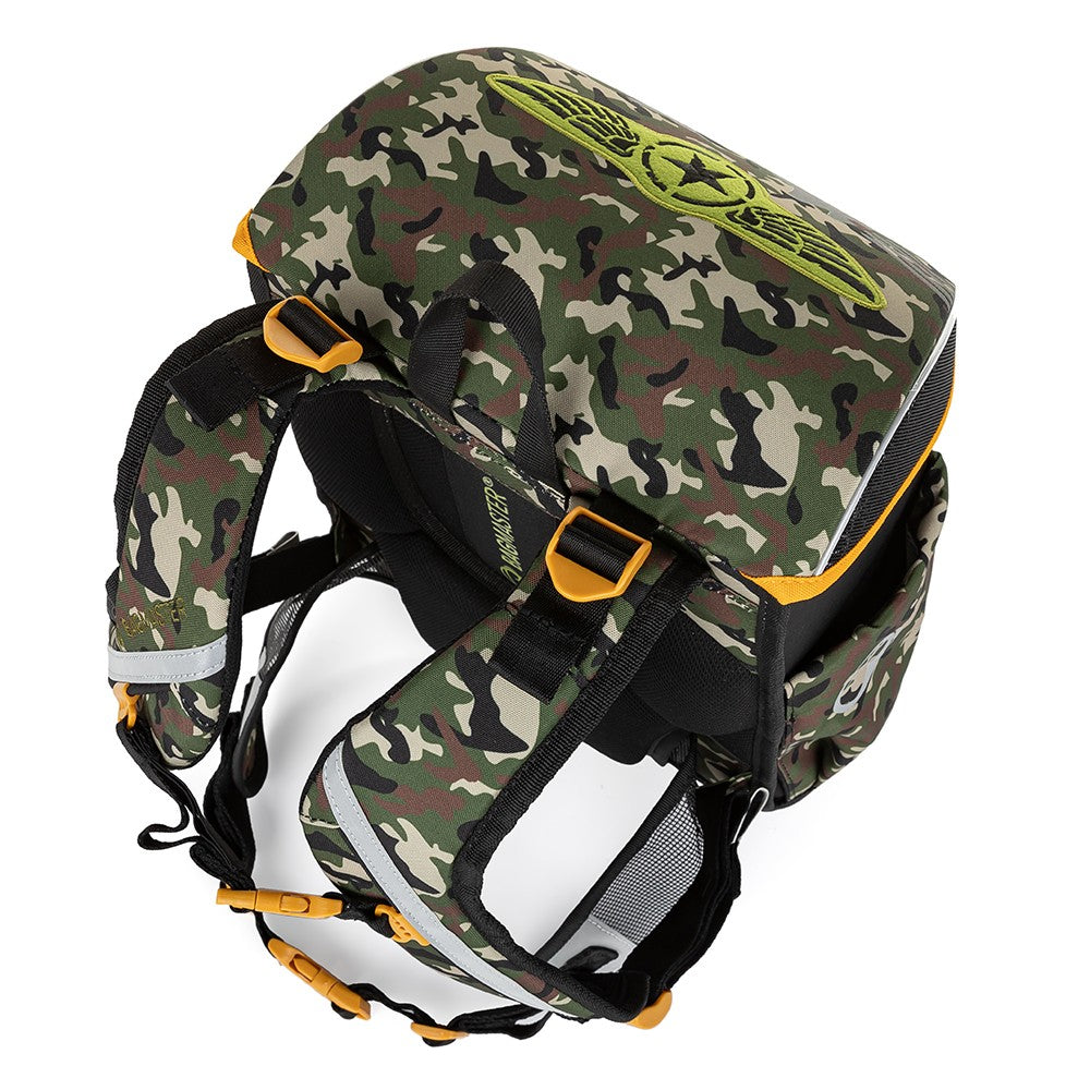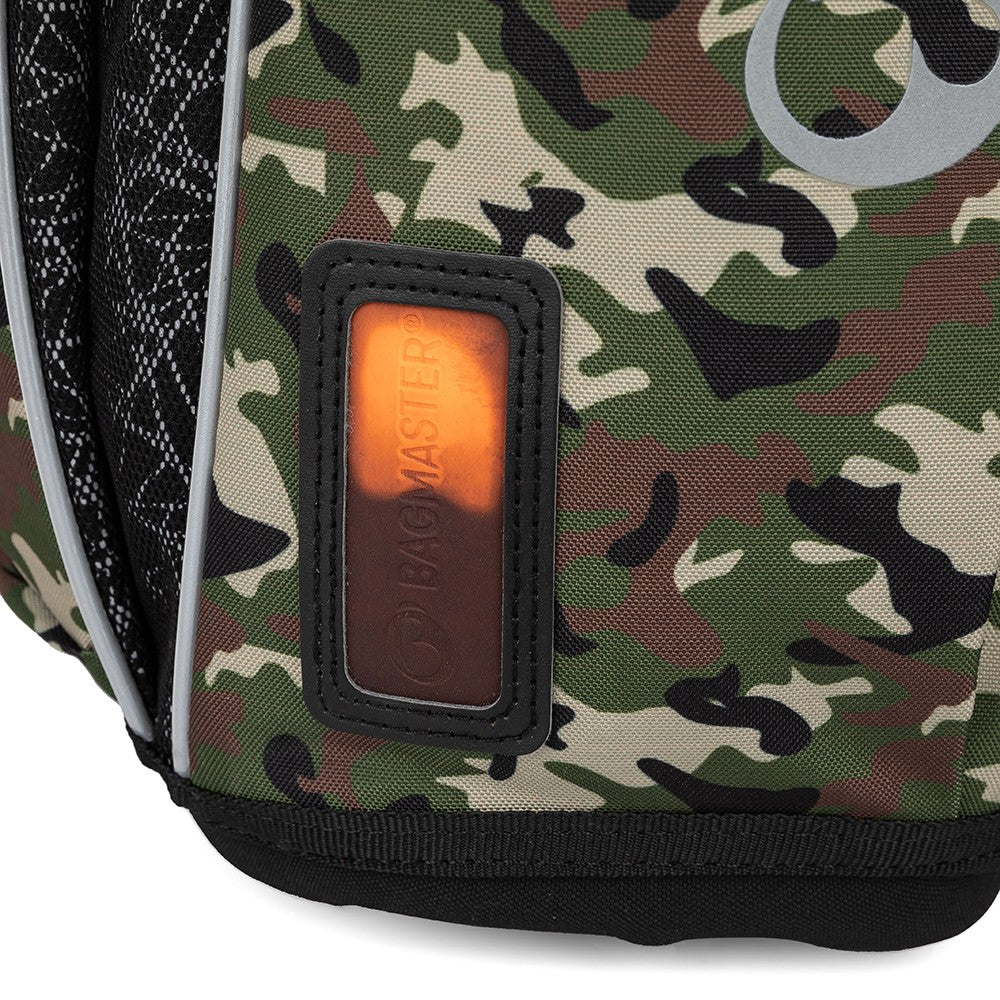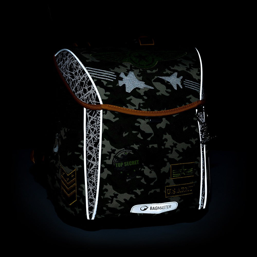 Cartella Bagmaster militare da bambino con motivo kaki e jet da combattimento. Ha uno scomparto trasparente e spazioso, un ampio scomparto anteriore con organizer, una tasca laterale per una bottiglia ed elementi riflettenti. È adatta a bambini di prima e seconda elementare con corporatura minuta.