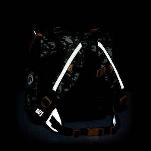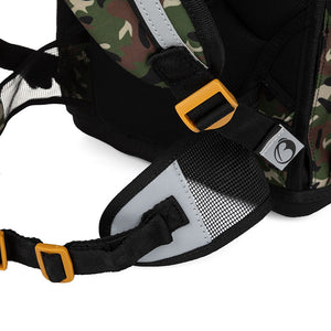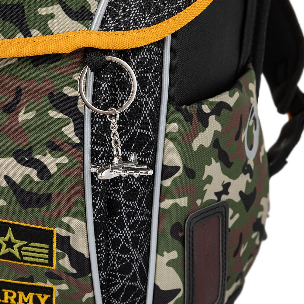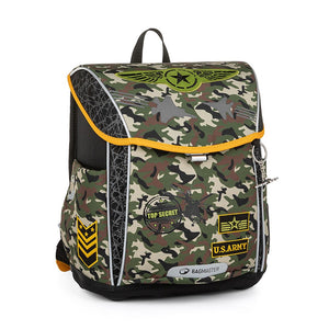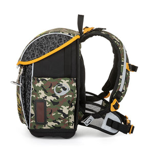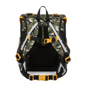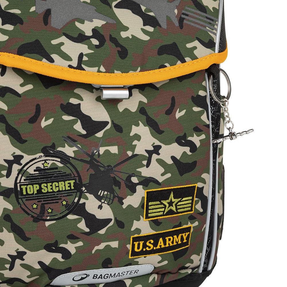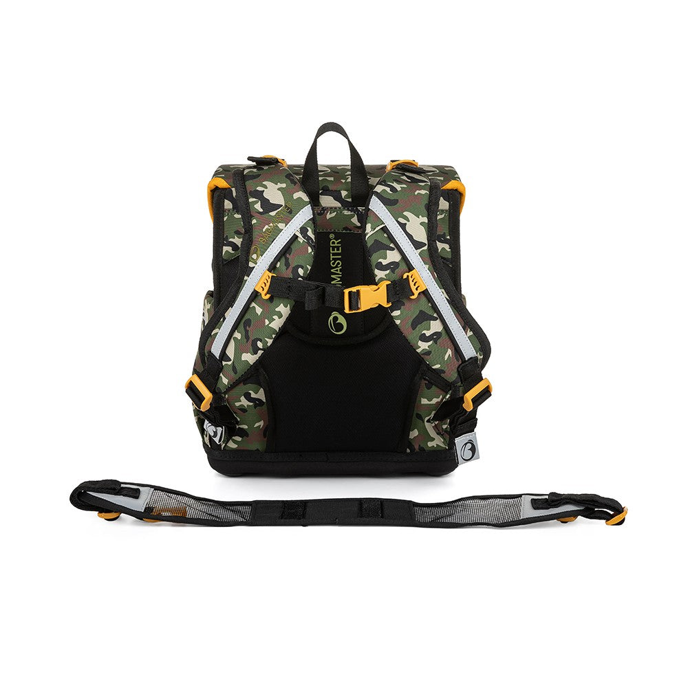 Cartella Bagmaster militare da bambino con motivo kaki e jet da combattimento. Ha uno scomparto trasparente e spazioso, un ampio scomparto anteriore con organizer, una tasca laterale per una bottiglia ed elementi riflettenti. È adatta a bambini di prima e seconda elementare con corporatura minuta.
