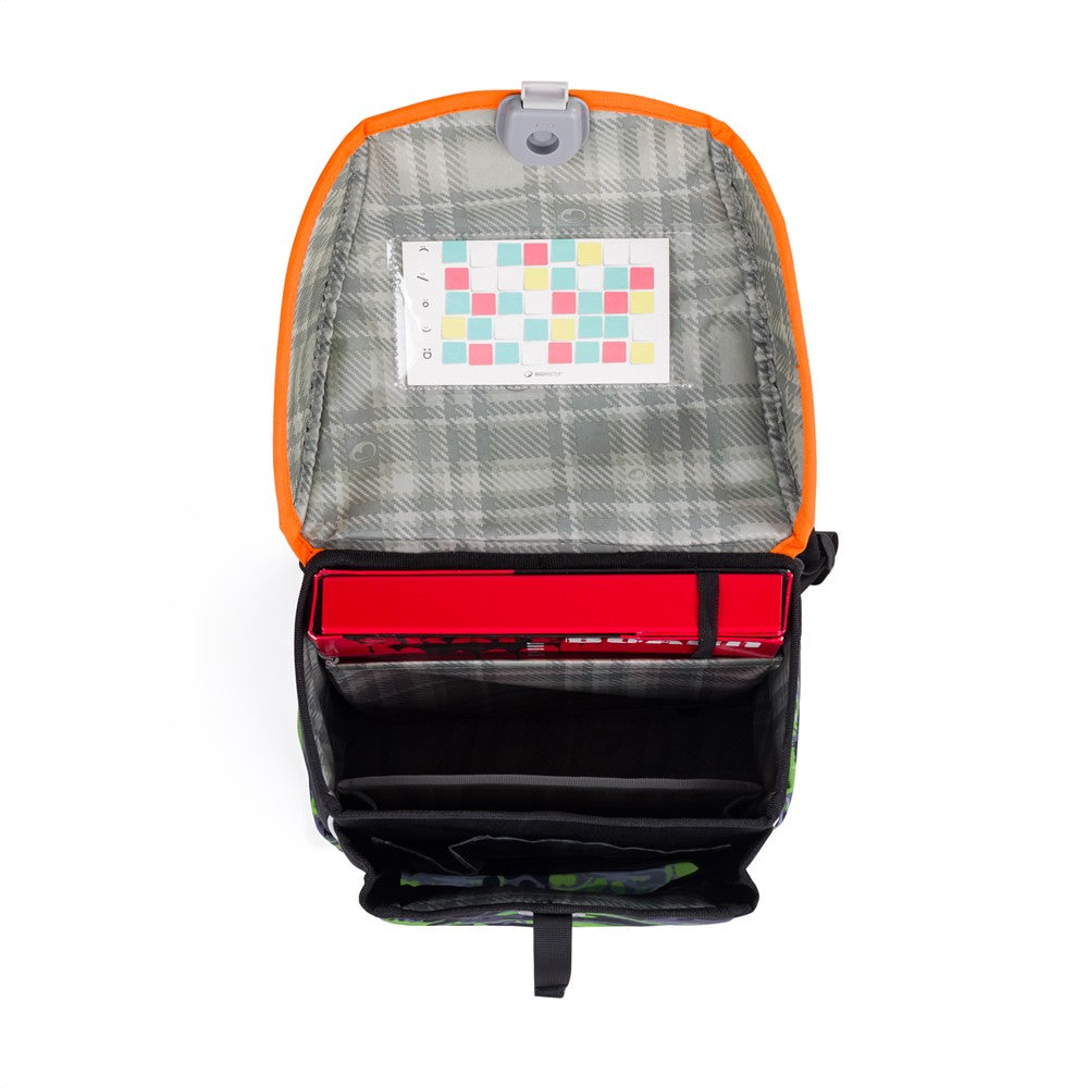 Cartella misteriosa da bambino Bagmaster con occhi leopardati. Ha uno scomparto ampio e trasparente, un ampio scomparto frontale con organizer, una tasca laterale per bottiglie, elementi riflettenti e una fibbia magnetica sulla patta. È adatta a bambini di prima e seconda elementare di corporatura minuta.