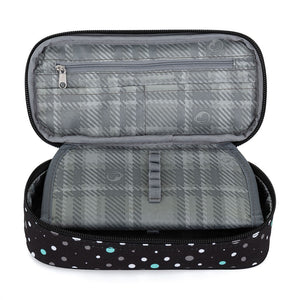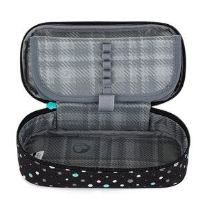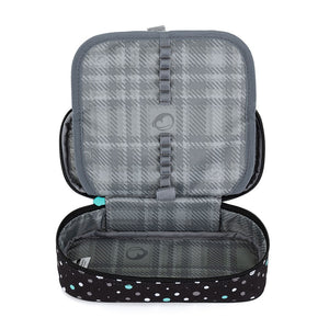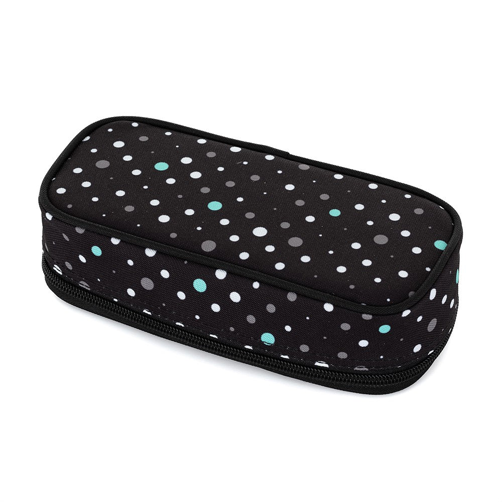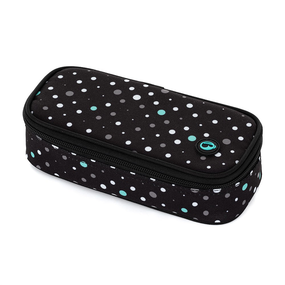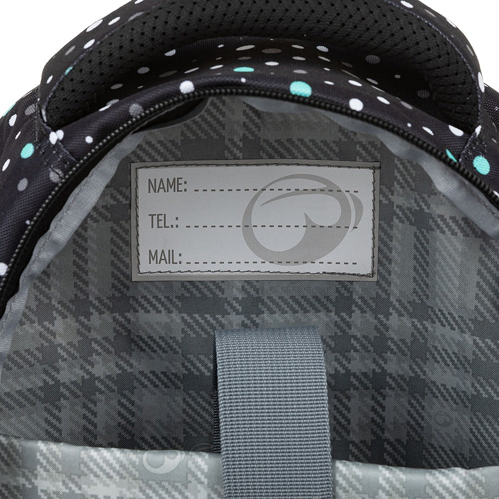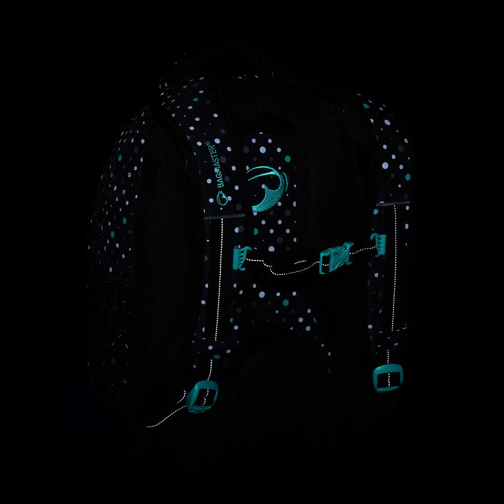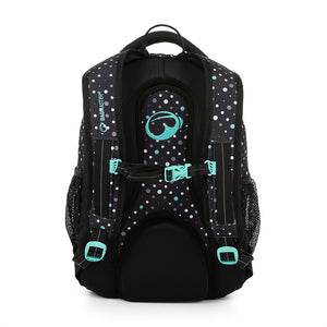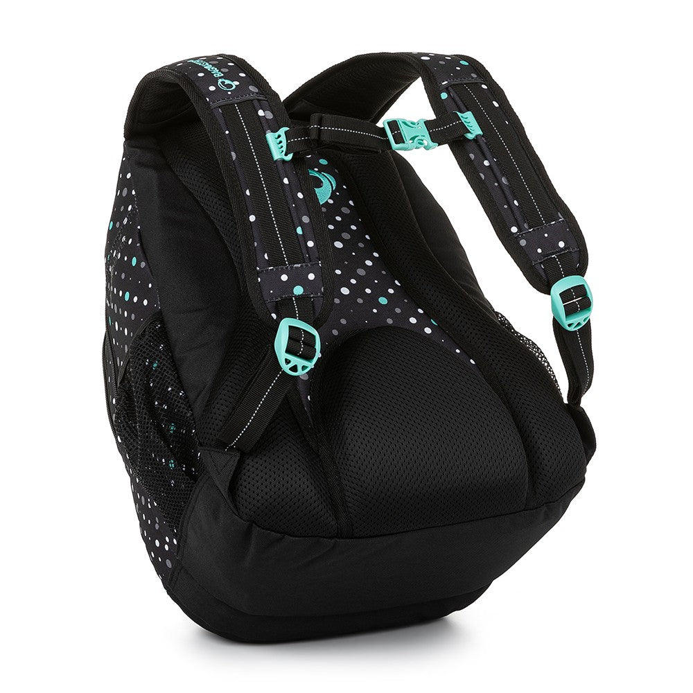Ecco Supernova, un set di zaino e astuccio a pois neri, bianchi e turchesi. Lo zaino ha uno schienale anatomico e spallacci morbidi. Pesa solo 0,7 kg. Grazie a questo, una studentessa può riporre libri di testo e uno spuntino sano. Tutto si adatta a tre ampi scomparti, tra cui una tasca imbottita per laptop e due tasche laterali in rete. Naturalmente, non mancano elementi riflettenti e gadget per una migliore organizzazione. Lo zaino sarà un fedele aiutante per una studentessa dalla quarta elementare alla scuola elementare.