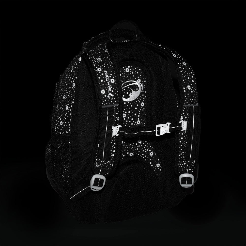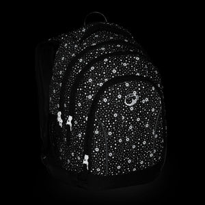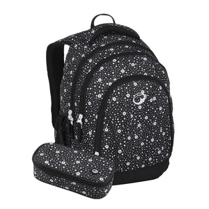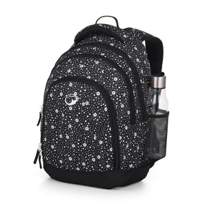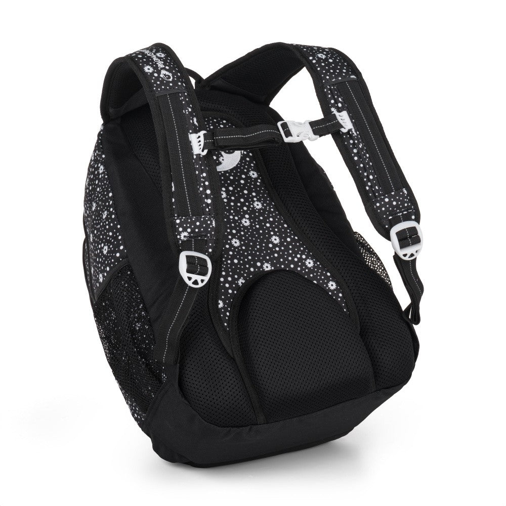 Ecco Supernova, uno zaino nero con fiori bianchi. Ha uno schienale anatomico e spallacci morbidi. Pesa solo 0,7 kg. Grazie a questo, una studentessa può portarci dentro libri di testo e uno spuntino sano. Tutto si adatta a tre ampi scomparti, tra cui una tasca imbottita per laptop e due tasche laterali in rete. Naturalmente, sono presenti elementi riflettenti e gadget per una migliore organizzazione. Lo zaino sarà un fedele aiutante per una studentessa dalla quarta elementare fino alla scuola elementare.